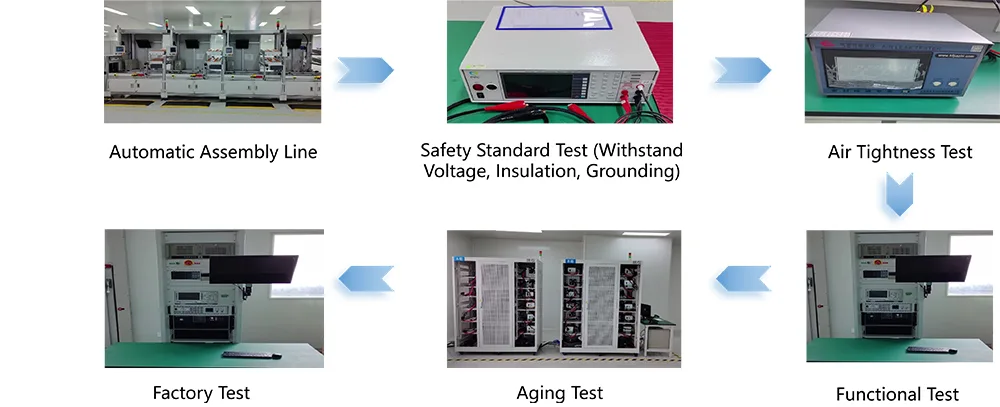Производот има добиено авторитативни сертификати дома и во странство, вклучувајќи CCC (Кина задолжителна сертификација), CE (Европска унија), UL (Соединетите Американски Држави) и EN50498. Тој е во согласност со стандардите NB/T33001-2025 и GB31241-2014, обезбедувајќи електрична безбедност и електромагнетна компатибилност. Поседуваме модерна производствена база и усвојуваме куќиште од композитен материјал ABS+PC отпорно на пламен со рејтинг V0 и ПХБ-плочки од фиберглас FR-4. Клучните споеви за лемење се обработуваат со помош на технологија за лемење со бранови и поминале ригорозни тестови како што се 5.000 циклуси на вметнување/вадење, отпорност на вибрации и отпорност на корозија со прскање со сол. Секоја единица е подложена на 72-часовен тест за стареење со полно оптоварување пред да ја напушти фабриката, со што се постигнува стапка на квалификација од 100%. Воспоставивме сеопфатен систем за контрола на квалитетот кој овозможува целосна следливост од набавка на суровини до испорака на готови производи.